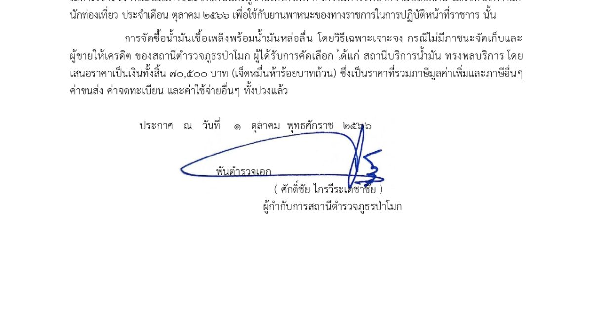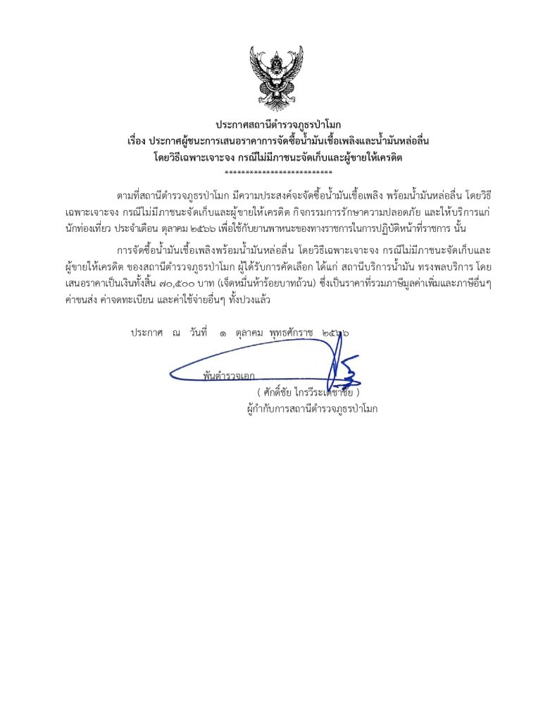 การจัดซื้อน้ำมันเชื้อเพลิงพร้อมน้ำมันหล่อลื่น โดยวิธีเฉพาะเจาะจง กรณีไม่มีภาชนะจัดเก็บและผู้ขายให้เครดิต ของสถานีตำรวจภูธรป่าโมก ผู้ได้รับการคัดเลือก ได้แก่ สถานีบริการน้ำมัน ทรงพลบริการ โดยเสนอราคาเป็นเงินทั้งสิ้น 70,500 บาท (เจ็ดหมื่นห้าร้อยบาทถ้วน) ซึ่งเป็นราคาที่รวมภาษีมูลค่าเพิ่มและภาษีอื่นๆ ค่าขนส่ง ค่าจดทะเบียน และค่าใช้จ่ายอื่นๆ ทั้งปวงแล้ว