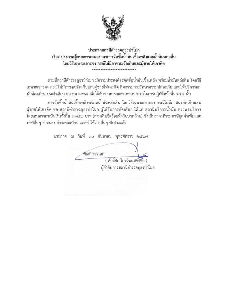 การจัดซื้อน้ำมันเชื้อเพลิงพร้อมน้ำมันหล่อลื่น โดยวิธีเฉพาะเจาะจง กรณีไม่มีภาชนะจัดเก็บและผู้ขายให้เครดิต ของสถานีตำรวจภูธรป่าโมก ผู้ได้รับการคัดเลือก ได้แก่ สถานีบริการน้ำมัน ทรงพลบริการ โดยเสนอราคาเป็นเงินทั้งสิ้น 3,750 บาท (สามพันเจ็ดร้อยห้าสิบบาทถ้วน) ซึ่งเป็นราคาที่รวมภาษีมูลค่าเพิ่มและภาษีอื่นๆ ค่าขนส่ง ค่าจดทะเบียน และค่าใช้จ่ายอื่นๆ ทั้งปวงแล้ว