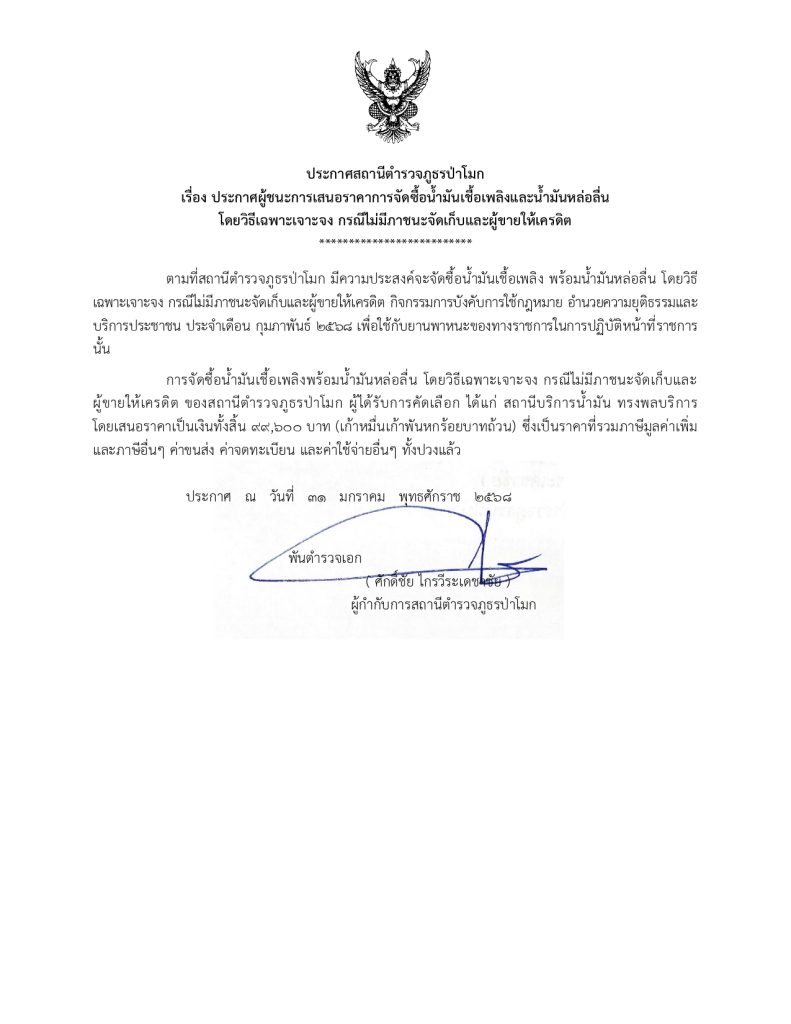 ตามที่สถานีตำรวจภูธรป่าโมก มีความประสงค์จะจัดซื้อน้ำมันเชื้อเพลิง พร้อมน้ำมันหล่อลื่น โดยวิธีเฉพาะเจาะจง กรณีไม่มีภาชนะจัดเก็บและผู้ขายให้เครดิต กิจกรรมการบังคับการใช้กฎหมาย อำนวยความยุติธรรมและบริการประชาชน ประจำเดือน กุมภาพันธ์ 2568 เพื่อใช้กับยานพาหนะของทางราชการในการปฏิบัติหน้าที่ราชการ นั้น