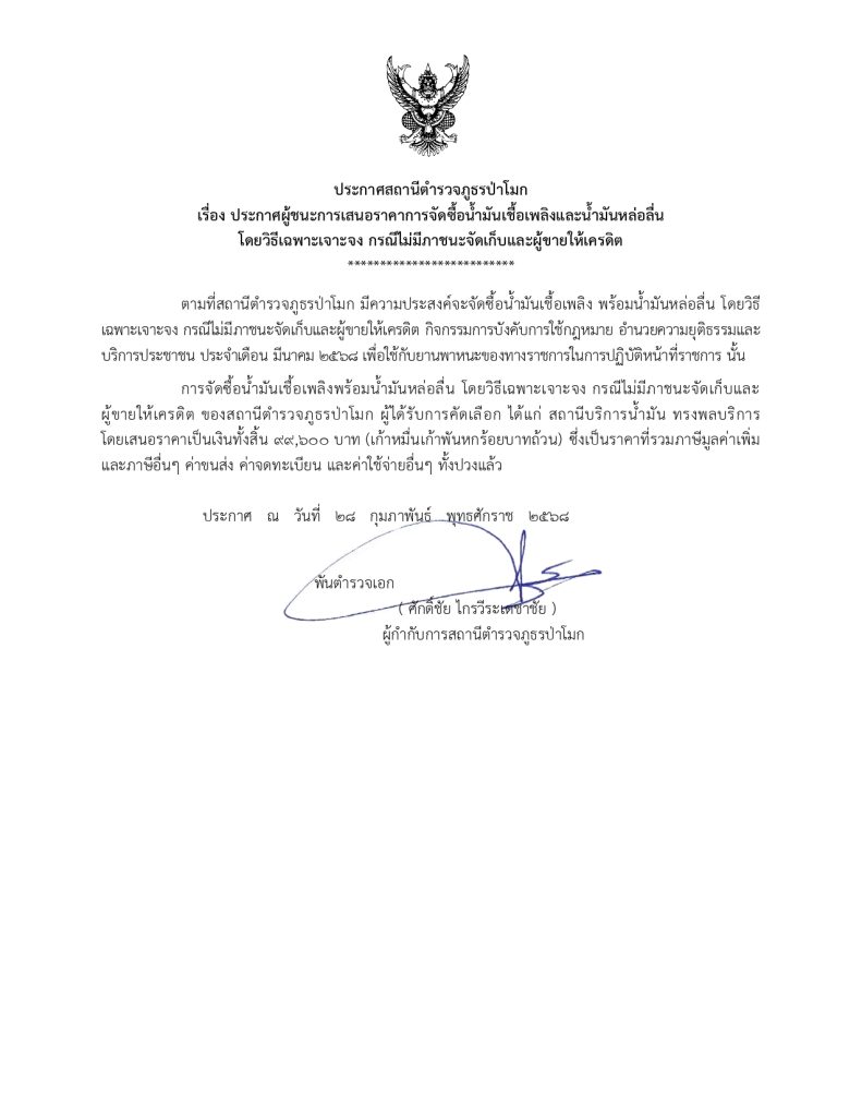 การจัดซื้อน้ำมันเชื้อเพลิงพร้อมน้ำมันหล่อลื่น โดยวิธีเฉพาะเจาะจง กรณีไม่มีภาชนะจัดเก็บและผู้ขายให้เครดิต ของสถานีตำรวจภูธรป่าโมก ผู้ได้รับการคัดเลือก ได้แก่ สถานีบริการน้ำมัน ทรงพลบริการ โดยเสนอราคาเป็นเงินทั้งสิ้น 99,600 บาท (เก้าหมื่นเก้าพันหกร้อยบาทถ้วน) ซึ่งเป็นราคาที่รวมภาษีมูลค่าเพิ่มและภาษีอื่นๆ ค่าขนส่ง ค่าจดทะเบียน และค่าใช้จ่ายอื่นๆ ทั้งปวงแล้ว