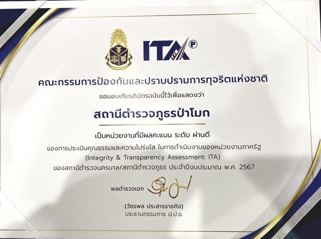ทั้งนี้ ก่อนเข้าระเบียบวาระการประชุม มีการมอบประกาศนียบัตร ให้กับสถานีตำรวจที่มีผลการประเมินคุณธรรมและความโปร่งใส ในการดำเนินงานของหน่วยงานภาครัฐ (Integrity & Transparency Assessment : ITA) ที่มีผลคะแนนระดับ ผ่านดี โดยทาง สภ.ป่าโมก