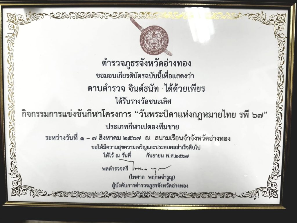 และมอบประกาศนียบัตร ให้กับเจ้าหน้าที่ตำรวจ ที่ได้รับรางวัลชนะเลิศ กิจกรรมการแข่งขันกีฬาโครงการ “วันพระบิดาแห่งกฎหมายไทย รพี 67“ ประเภทกีฬาเปตองทีมชาย โดยทาง สภ.ป่าโมก มีผู้ได้รางวัลชนะเลิศ ได้แก่