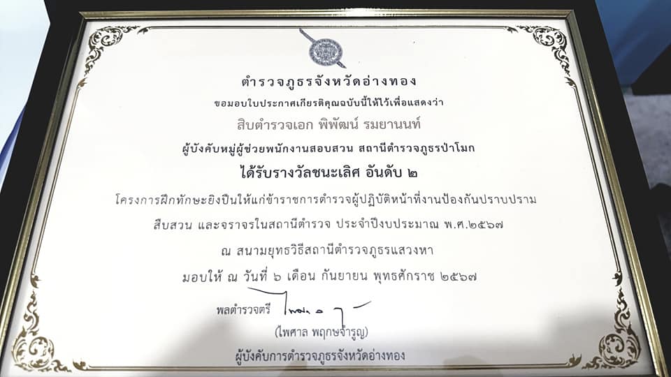 และมอบประกาศนียบัตร ให้กับเจ้าหน้าที่ตำรวจ ในโครงการฝึกทักษะยิงปืนให้แก่ข้าราชการตำรวจผู้ปฏิบัติหน้าที่งานป้องกันปราบปราม สืบสวน และจราจรในสถานีตำรวจ ประจำปีงบประมาณ พ.ศ.2567 โดยทาง สภ.ป่าโมก มีผู้ได้รางวัลชนะเลิศอับดับ (2) ได้แก่