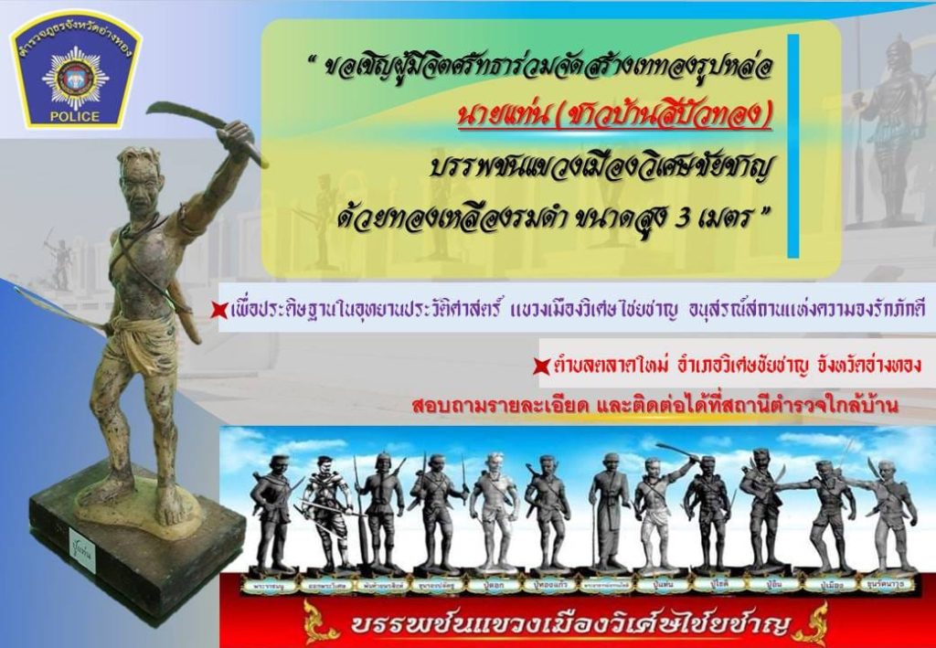 สถานีตำรวจภูธรป่าโมก ขอเรียนเชิญพี่น้องประชาชน ข้าราชการตำรวจผู้มีจิตศรัทธา ร่วมจัดสร้างเททองรูปหล่อนายแท่น (ชาวบ้านสีบัวทอง) บรรพชนแขวงเมืองวิเศษชัยชาญ ด้วยทองเหลืองรมดำ ขนาดสูง 3 เมตร เพื่อประดิษฐานในอุทยานประวัติศาสตร์ แขวงเมืองวิเศษไชยชาญ อนุสรณ์สถานแห่งความจงรักภักดี เพื่อรำลึกและเทิดทูนเกียรติประวัติวีรกรรมความกล้าหาญ เสียสละ ของวีรชนแขวงเมืองวิเศษไชยชาญ ที่ได้ต่อสู้ปกป้องชาติ แผ่นดิน ด้วยชีวิต และเลือดเนื้อ เพื่อรักษาแผ่นดินไว้ให้แก่ลูกหลาน ร่วมเช่าบูชาแผ่นทอง ร่วมเป็นเจ้าภาพ หล่อนายแท่น (ชาวบ้านสีบัวทอง) โดยสามารถติดต่อสอบถามรายละเอียดและ ติดต่อได้ที่สถานีตำรวจใกล้บ้านในพื้นที่จังหวัดอ่างทอง หรือร่วมทอดผ้าป่า ณ วัดสีบัวทองในวันที่ 27 กรกฎาคม 2567 เวลา 11.00 น