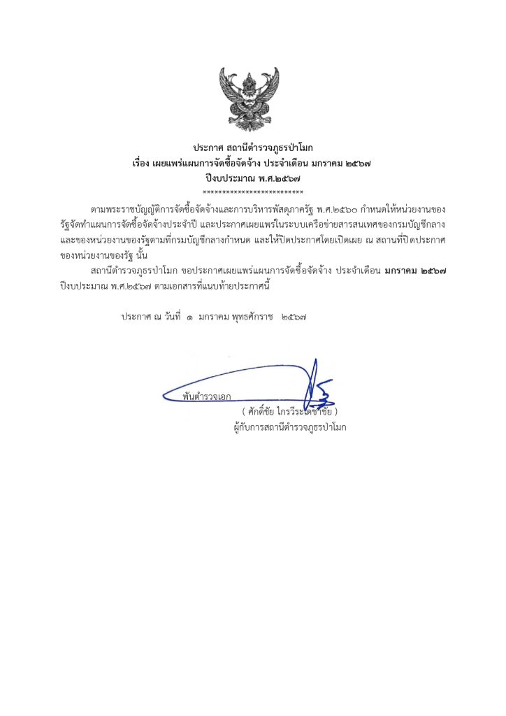 สถานีตำรวจภูธรป่าโมก ขอประกาศเผยแพร่แผนการจัดซื้อจัดจ้าง ประจำเดือน มกราคม 2567ปีงบประมาณ พ.ศ.2567 ตามเอกสารที่แนบท้ายประกาศนี้