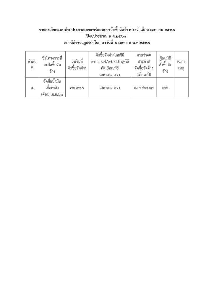 สถานีตำรวจภูธรป่าโมก ขอประกาศเผยแพร่แผนการจัดซื้อจัดจ้าง ประจำเดือน เมษายน 2567ปีงบประมาณ พ.ศ.2567 ตามเอกสารที่แนบท้ายประกาศนี้