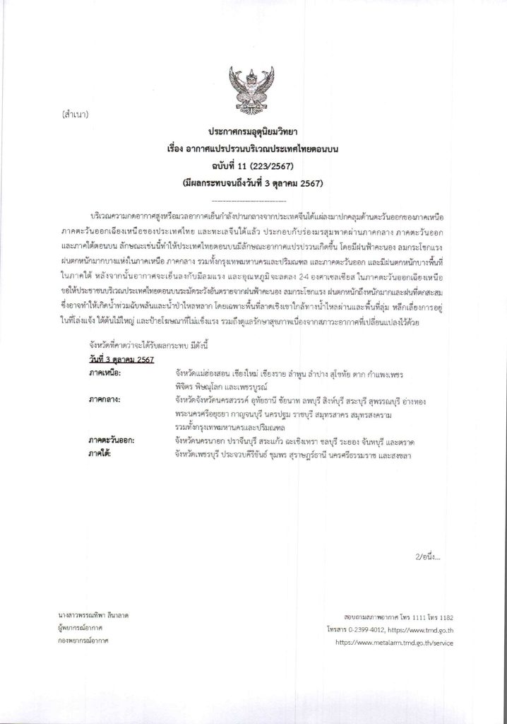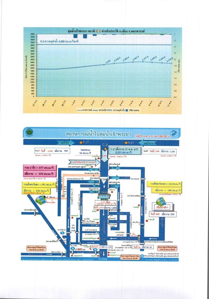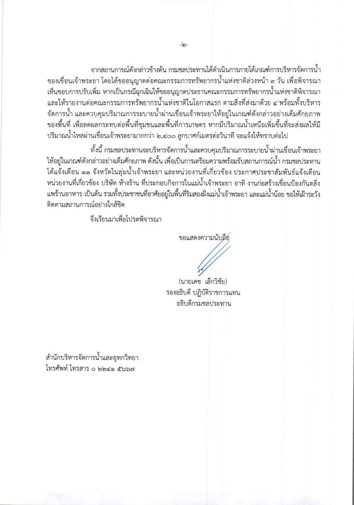 กรมชลประทาน แจ้งเตือนสถานการณ์น้ำลุ่มน้ำเจ้าพระยา ฉบับที่ 10 ตามรายละเอียดที่แนบ โดยสรุป : คาดการณ์ไว้ล่วงหน้าว่าปริมาณน้ำไหลผ่านเขื่อนเจ้าพระยาจะมีแนวโน้มสูงขึ้น และมีความจำเป็นที่จะต้องระบายท้ายเขื่อนเจ้าพระยาเพิ่มขึ้นแบบขั้นบันได ในอัตราไม่เกิน 2,400 ลูกบาศก์เมตรต่อวินาที