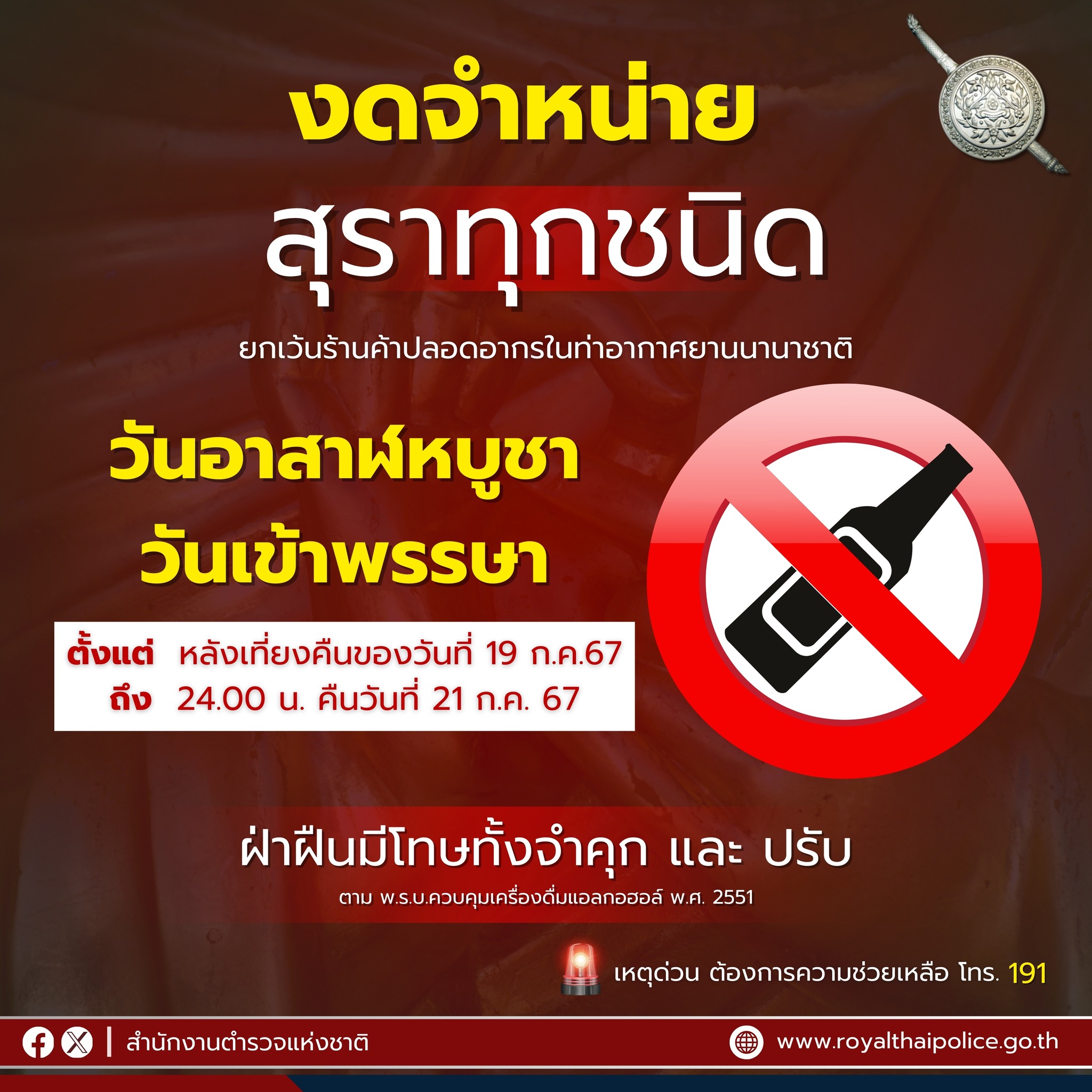 วันอาสาฬหบูชา และ วันเข้าพรรษา 2567 งดจำหน่าย “สุราทุกชนิต” ทั้งแบบปลีก – ส่ง ยกเว
